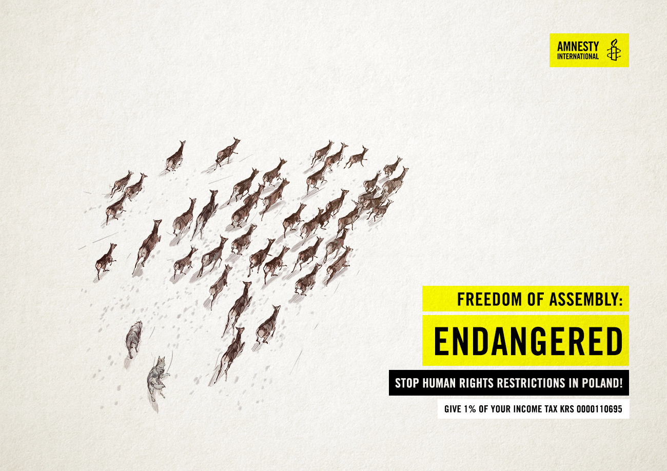 The goal of the campaign was to show areas of concern (privacy rights, discrimination and politics of fear, judiciary independence, freedom of association, freedom of assembly, freedom of artistic expression) and point out a solution (donation of 1% of income tax). It was important not to address any specific events or directly criticize the government. That’s how "Endangered Species” came to life. The series explains important human issues while referring to the animal world. The metaphor of animals posing as humans is firmly rooted in "Aesop’s Fables" and remains apolitical at the same time.