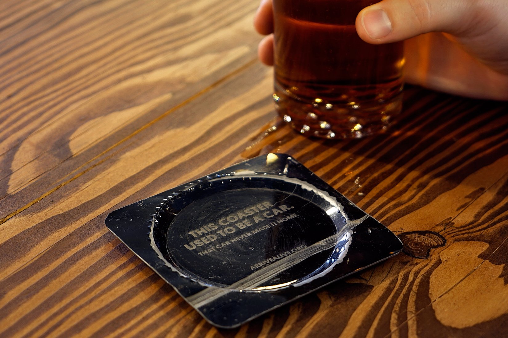 On St. Patrick's Day, Arrive Alive and The Emmet Ray bar served coasters made from car wrecks to partiers as a sobering reminder to not drink and drive. On the coasters were laser-etched messages.