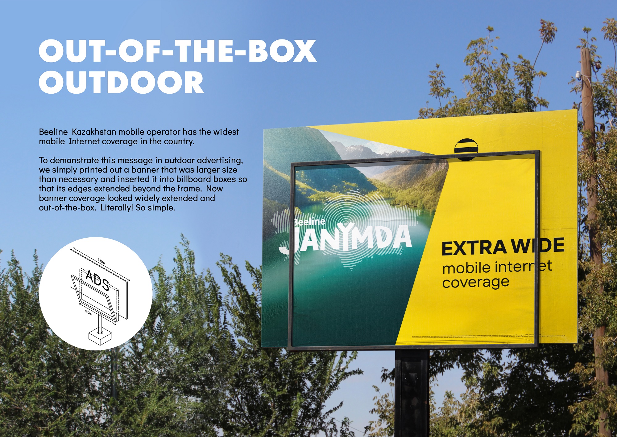 Beeline Kazakhstan mobile operator has the widest mobile Internet coverage in the country. To demonstrate this in outdoor advertising, we simply printed out a banner that was larger size than necessary and inserted it into billboard boxes so that its edges extended beyond the frame. Now banner coverage looked widely extended and out-of-the-box. Literally! So simple!