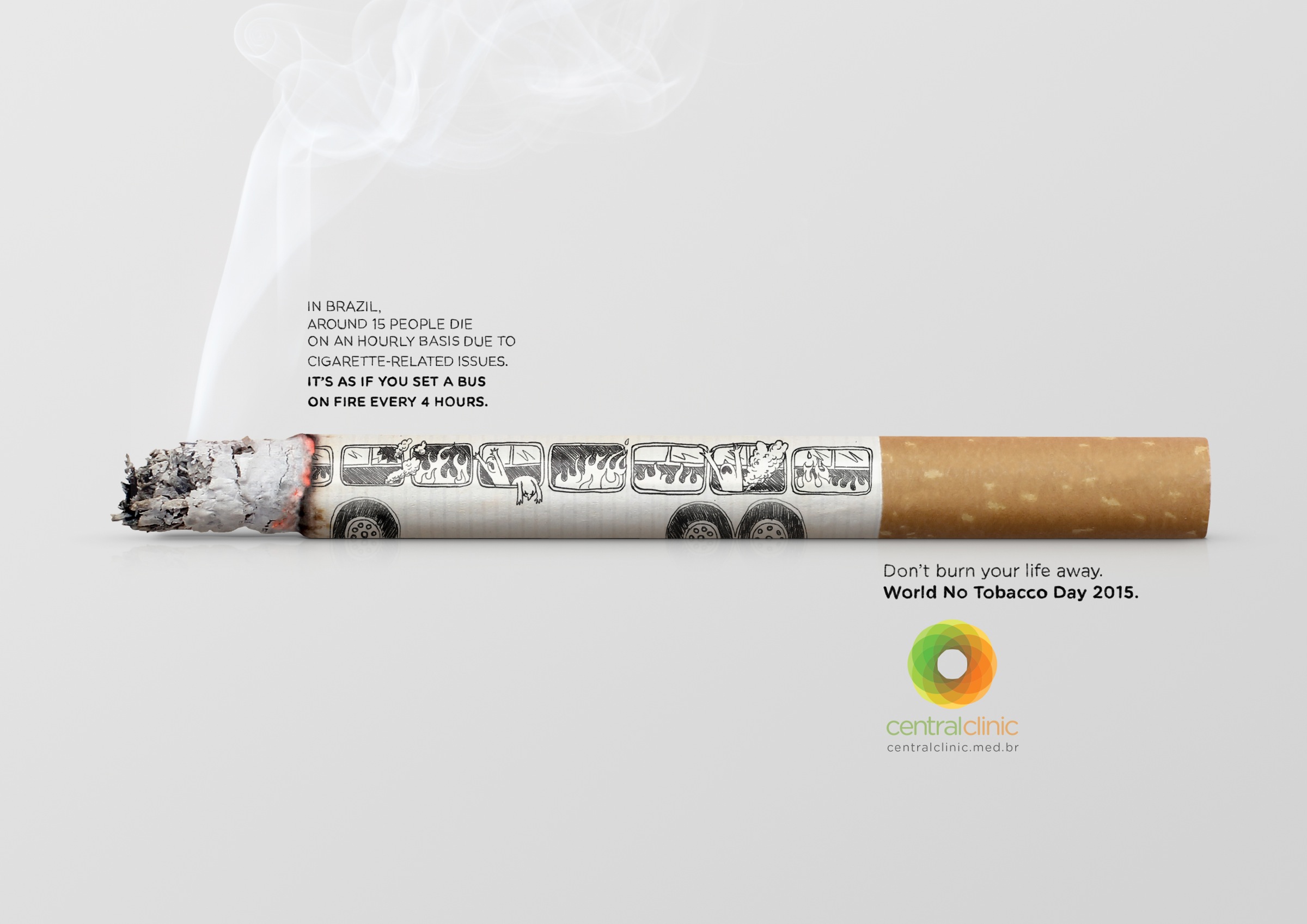 "In Brazil around 15 people die on an hourly basis due to cigarette-related issues. It’s as if you set a bus on fire every four hours. Don’t burn your life away. World No Tobacco Day 2015"