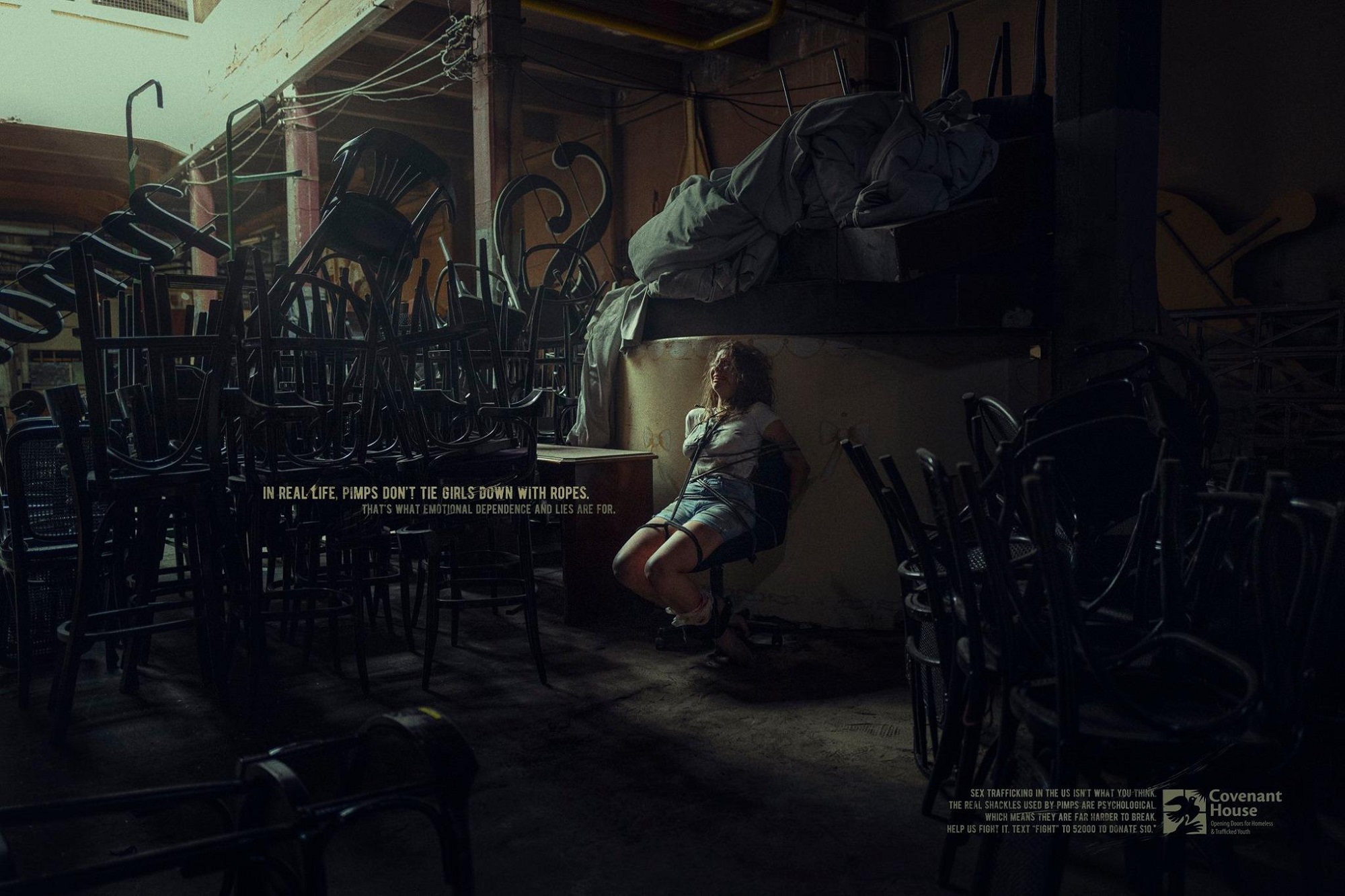 Sex trafficking in the US isn't what you think. The real shackles used by pimps are physiological, which means they are far harder to break. Help us fight it. Text: "FIGHT" to 52000 to donate $10.