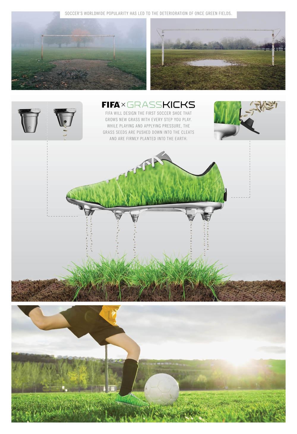 FIFA will design the firs soccer shoe that grows new grass with every step you play. While playing and applying pressure, the grass seeds are pushed down into the cleats and are firmly planted into the earth.
