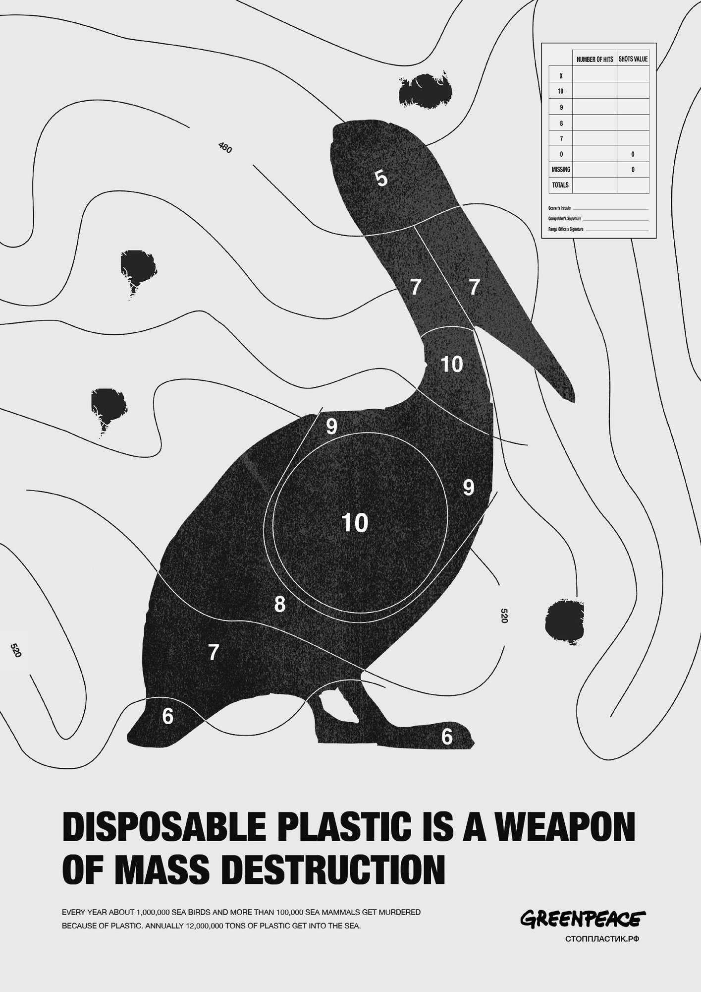 In Russia, lethal weapons are either forbidden or their sale is strictly regulated. However, there is no law to control the sale of another deadly weapon that all of us can access. Widespread and powerful, it causes numerous deaths on a daily basis. Over 90% of all plastic ever produced has not been recycled. It is still present in the environment and in landfills, with over 1 million animals dying annually as a result of its ingestion (according to the United Nations Ocean Conference fact sheet). Humans are not immune either, with harmful plastic micro-particles entering our bodies through water and food. These prints are a part of the wide-scale campaign by Greenpeace Russia and POSSIBLE Moscow aimed at raising awareness of the situation.