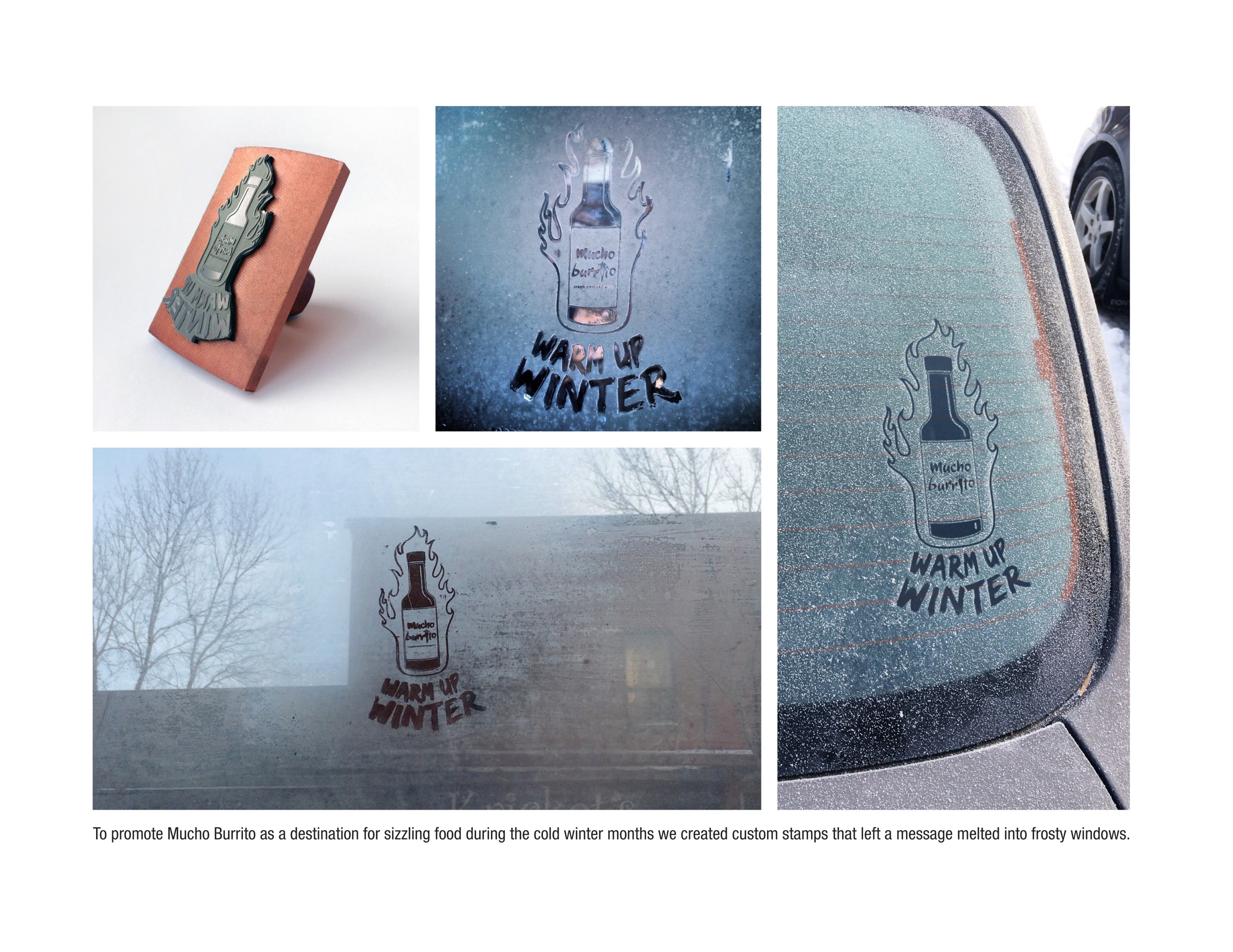 To promote Mucho Burrito as a destination for sizzling food during the cold winter months we created custom stamps that left a message melted into frosty windows.