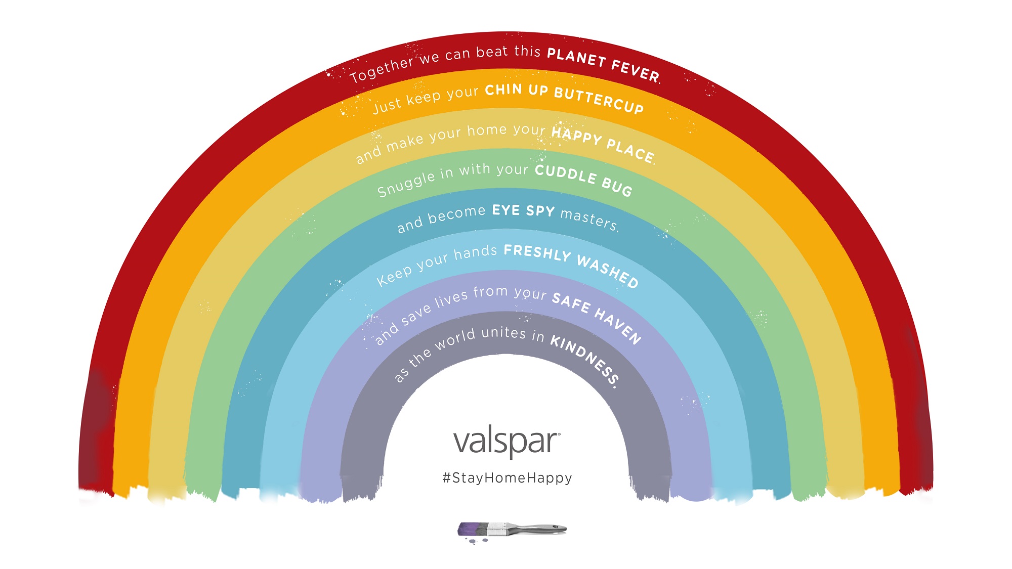 With the rainbow becoming the enduring symbol of hope at this time of turmoil, FCB Inferno created a colour-in version for kids featuring the matching paint names to inspire families to #stayhomehappy for Valspar.