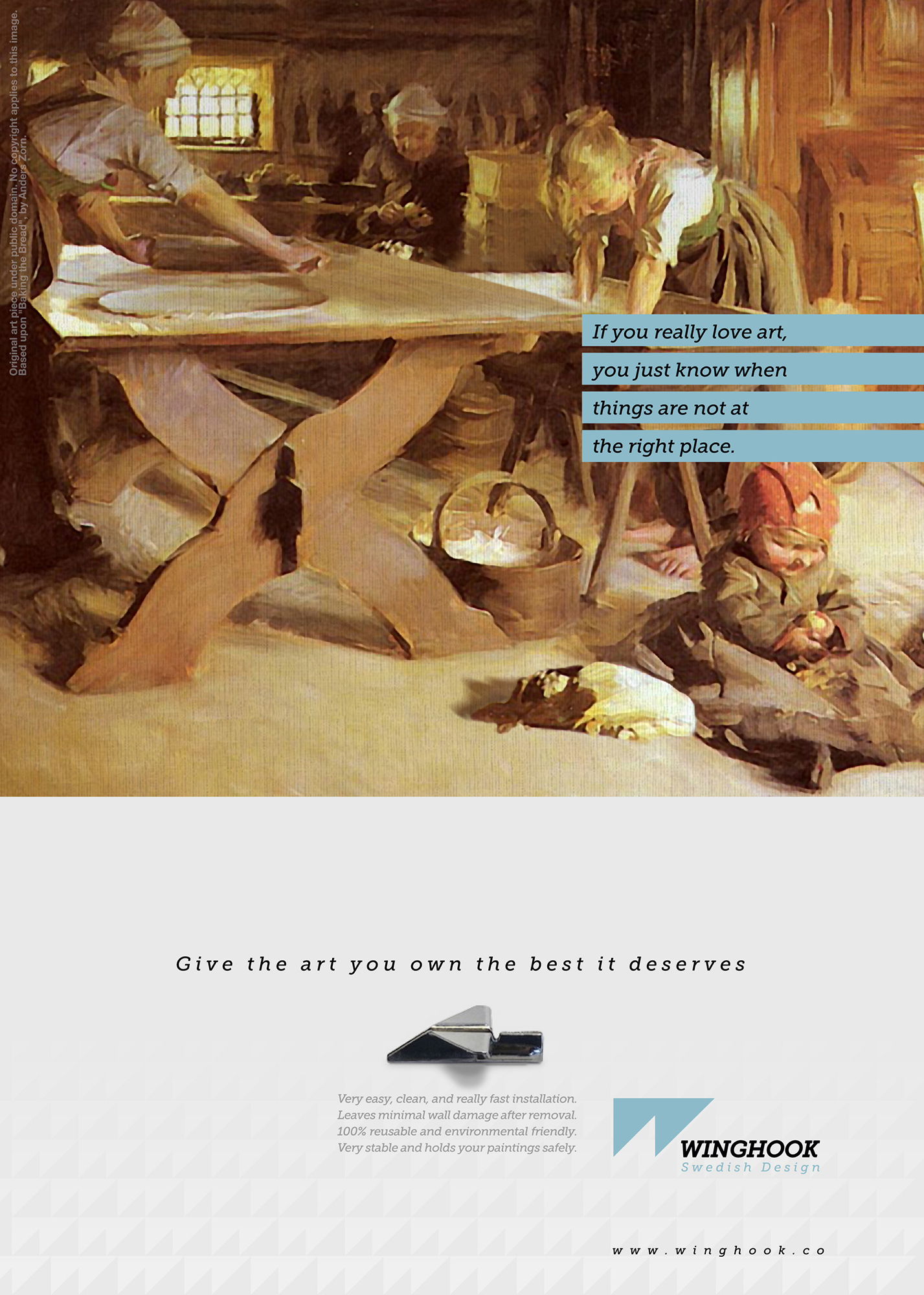 For the first campaign of Winghook, we needed to be bold and make a statement. Winghhok has a Swedish design DNA, and is neither a nail, nor a screw. It’s better than all of those old fashioned things, and it holds your art on the wall in a fast, clean, easy-to-install, and safe way. So, by using famous paintings of Art History in a new, surprising way, we make clear that, if things are not in their right place, you will notice in a minute. By digitally editing some masterpieces, replacing elements, rearranging known visuals, or simply taking off the scene other parts, we created whole new paintings, full of meanings, that relate directly to the usage and the efficiency of the product. Now, your challenge is to find out whats is missing or different on all of those images. Can you do that? If you really love art, you can.