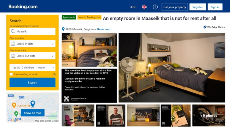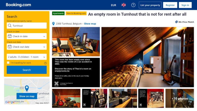During the end of the year holiday season, many Belgians are driving to their holiday destination. To raise awareness among these drivers to be careful on the road and to reduce speed in the sometimes-difficult winter conditions, the association Parents of Road Victims (OVK-PEVR) placed several rooms of children who fell victim to road accidents symbolically on Booking.com.