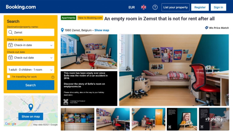 "When parents lose a child in a road accident, they often leave their bedroom the way it was the day their child left for the last time. It is one of the most tangible memories parents can have. The unchanged nature of the room means they can still feel the presence of their child. Now that many people will be travelling on holiday, we are putting some of these rooms on Booking.com as a symbolic act to make the link between travelling, booking rooms and driving carefully."