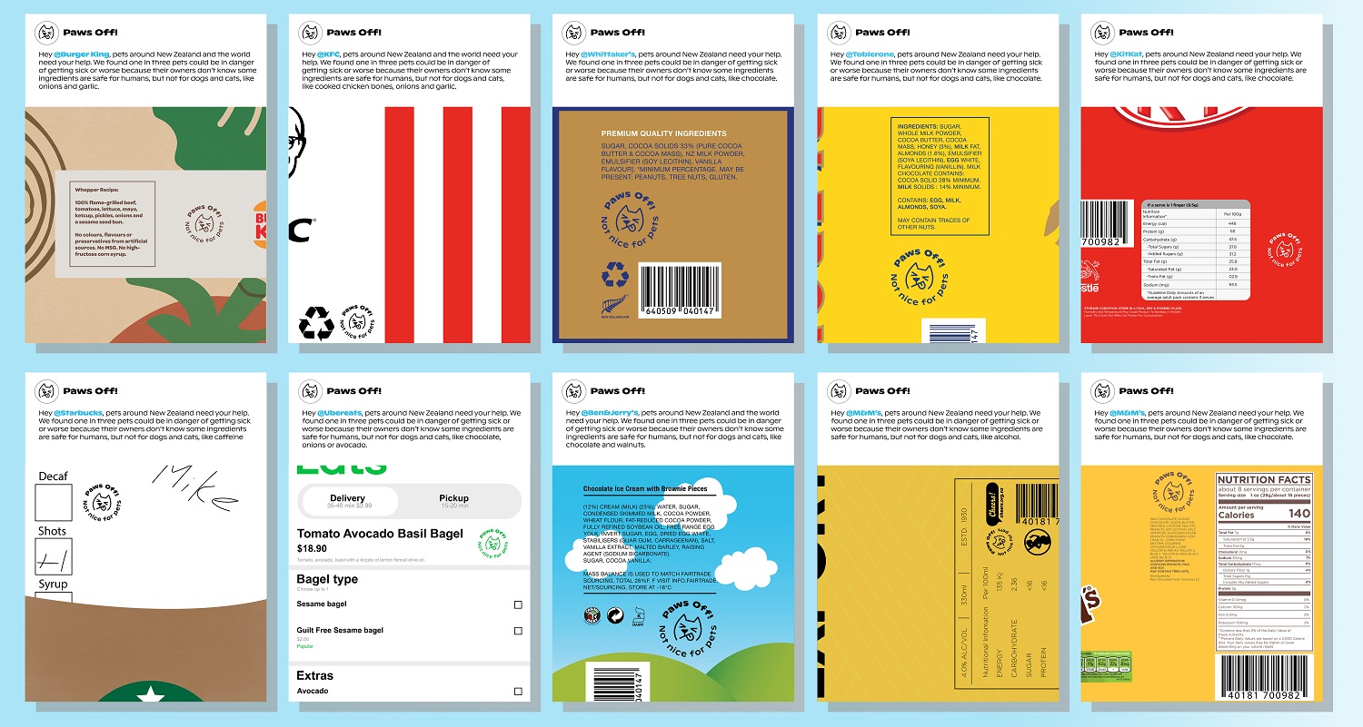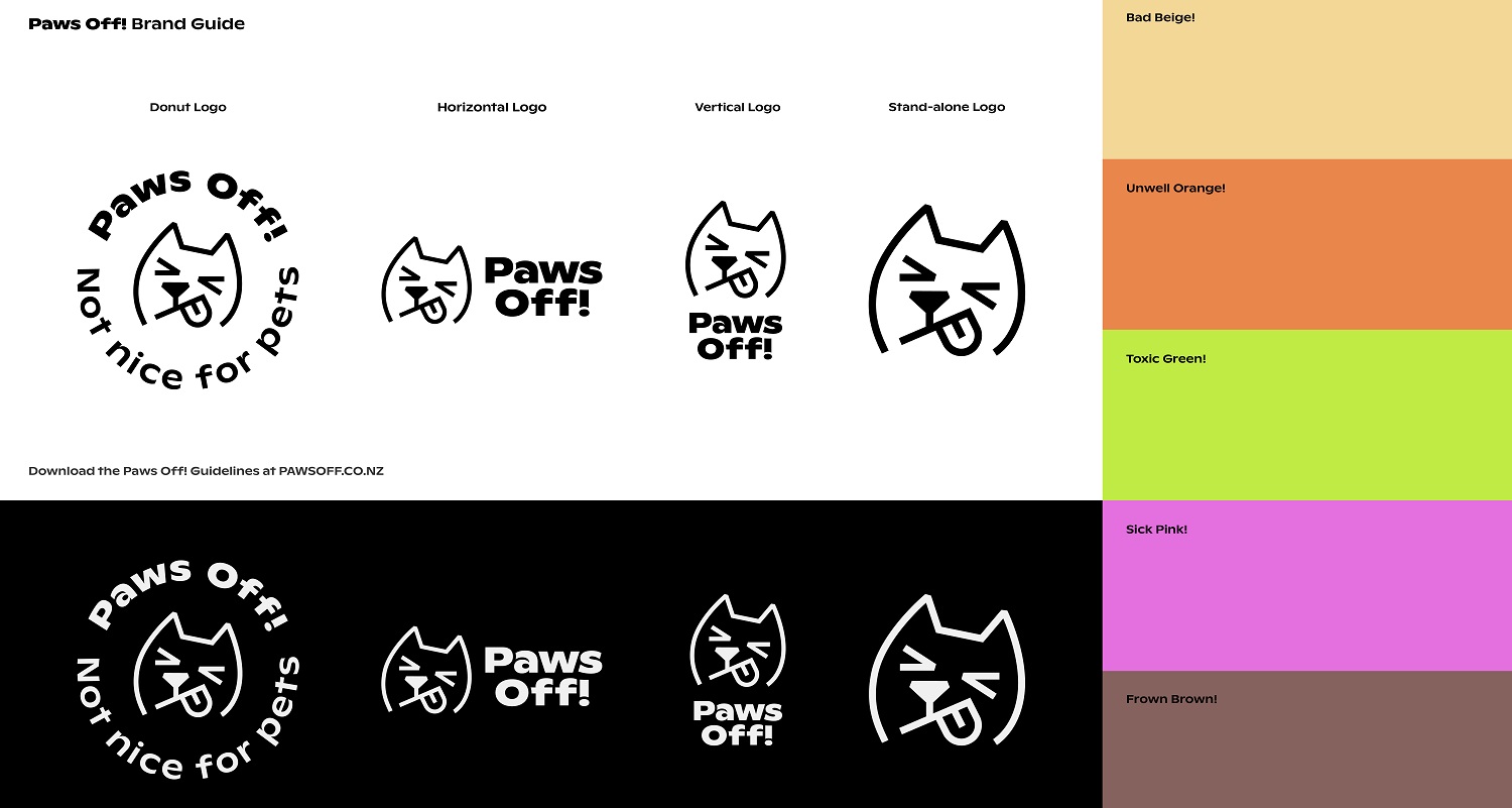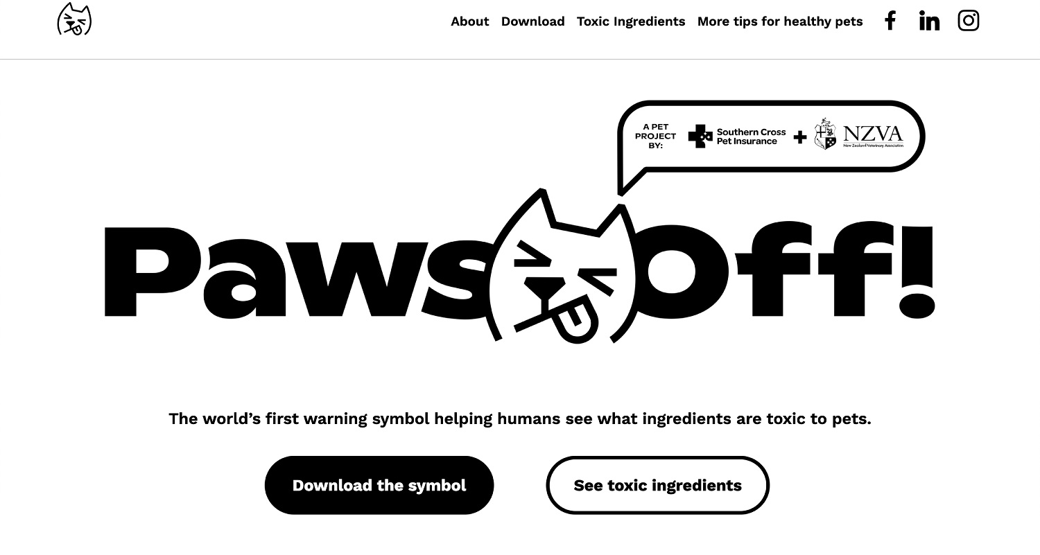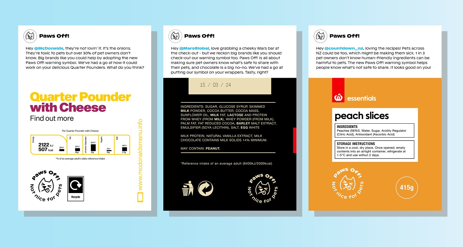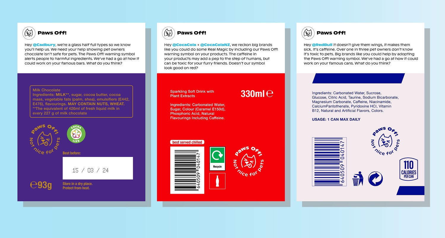 "We’re really proud to launch this special project with our partners at Southern Cross Pet Insurance and NZVA. We hope the warning symbol is adopted by brands far and wide to help educate all humans on items that have the potential to make our pets sick. We’ve already had encouraging conversations with lots of brands and businesses about Paws Off!, and I’d like to invite anyone in the food and drink industry to reach out and support Paws Off! in some way. Seachange Studio also did an awesome job working with us to create the symbol and design system so it can be easily applied and used."
