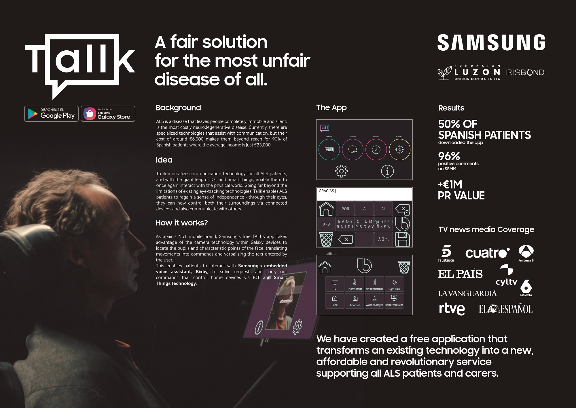 Cheil Worldwide España and Samsung have launched a new app which allows Spanish-speaking ALS patients to not only keep communicating with their families, friends and carers but to control utilities in their homes, such as lights and TV, after the disease impacts their ability to speak or move.