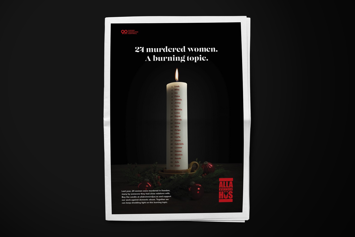 "Alla Kvinnors Hus plays an important role in helping adults and children who have been victims of domestic violence. Their tireless commitment has inspired and touched us deeply. We are very proud to highlight their important work with this campaign and get more people to support them. In the communication of the campaign, we highlight a classic Swedish Christmas phenomenon – the advent candle – but the cozy feeling is quickly replaced when you see the following names and understand the context."