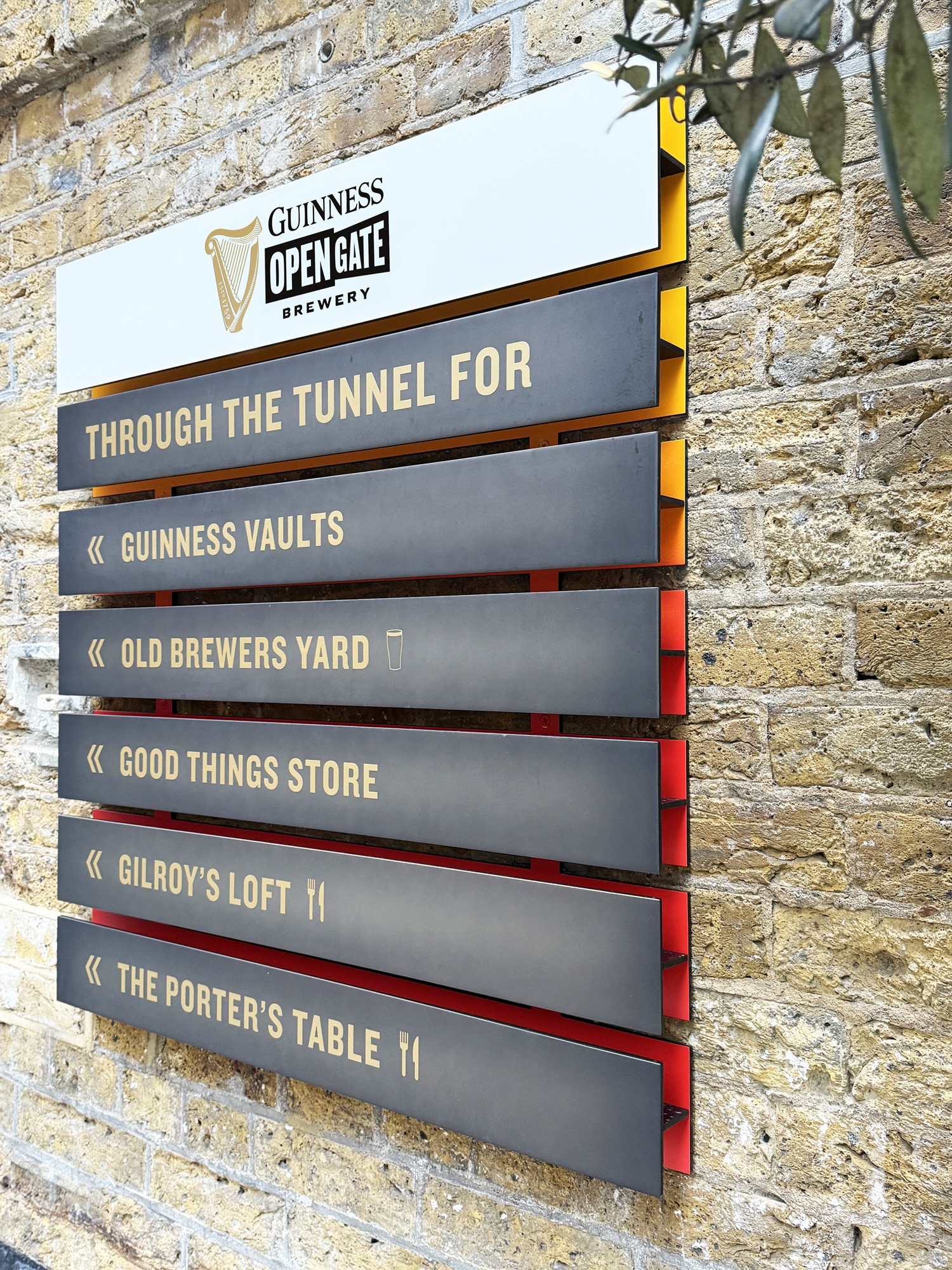 Guinness Open Gate Brewery occupies multiple buildings across an historic and complex Quarter, therefore way-finding had to functionally assist both planned and unplanned visitors, giving them a sense of what’s on offer and how to locate each offer, while guiding flow around the site. The concept behind the wayfinding throughout the site is “Discover the Unexpected”. The design is creative, playful and distinctly Guinness, and reflects the vibrancy of the brand while aligning with the creativity and character of the neighbourhood of Covent Garden. The aim is to convey brand warmth, tell authentic stories and make people smile in a way that only Guinness can.