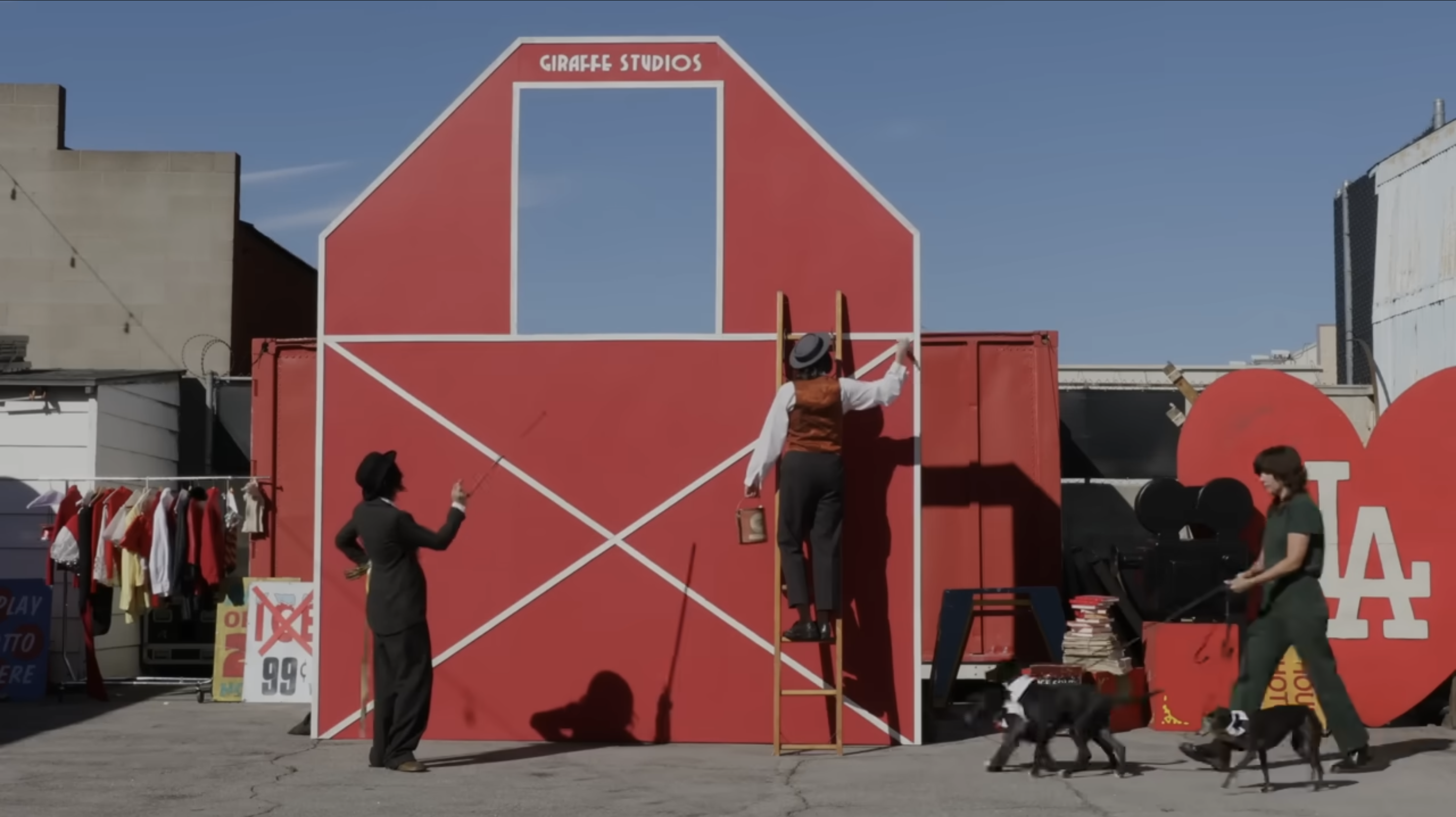 With a small crew, a Sprinter van, a Black Magic camera, and a cast rounded out by friends and family, the run-and-gun shoot took place over a weekend. The Giraffe Sisters, who are resident Charlie Chaplin and Buster Keaton impersonators at the historic United Theater in downtown LA, also took the opportunity to infuse choreography into the spontaneity by recreating a Buster Keaton stunt alongside Barnett’s cameo in the video.