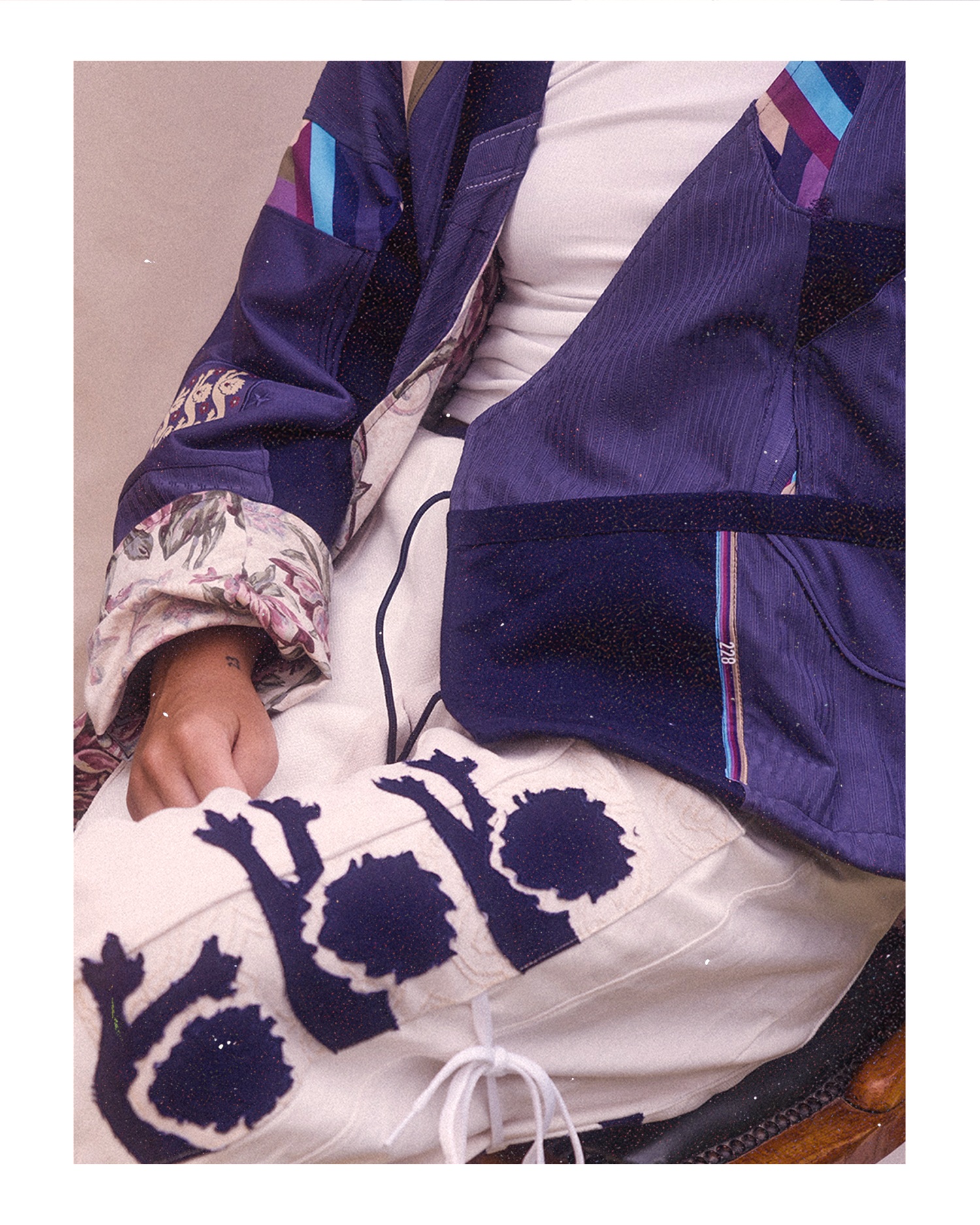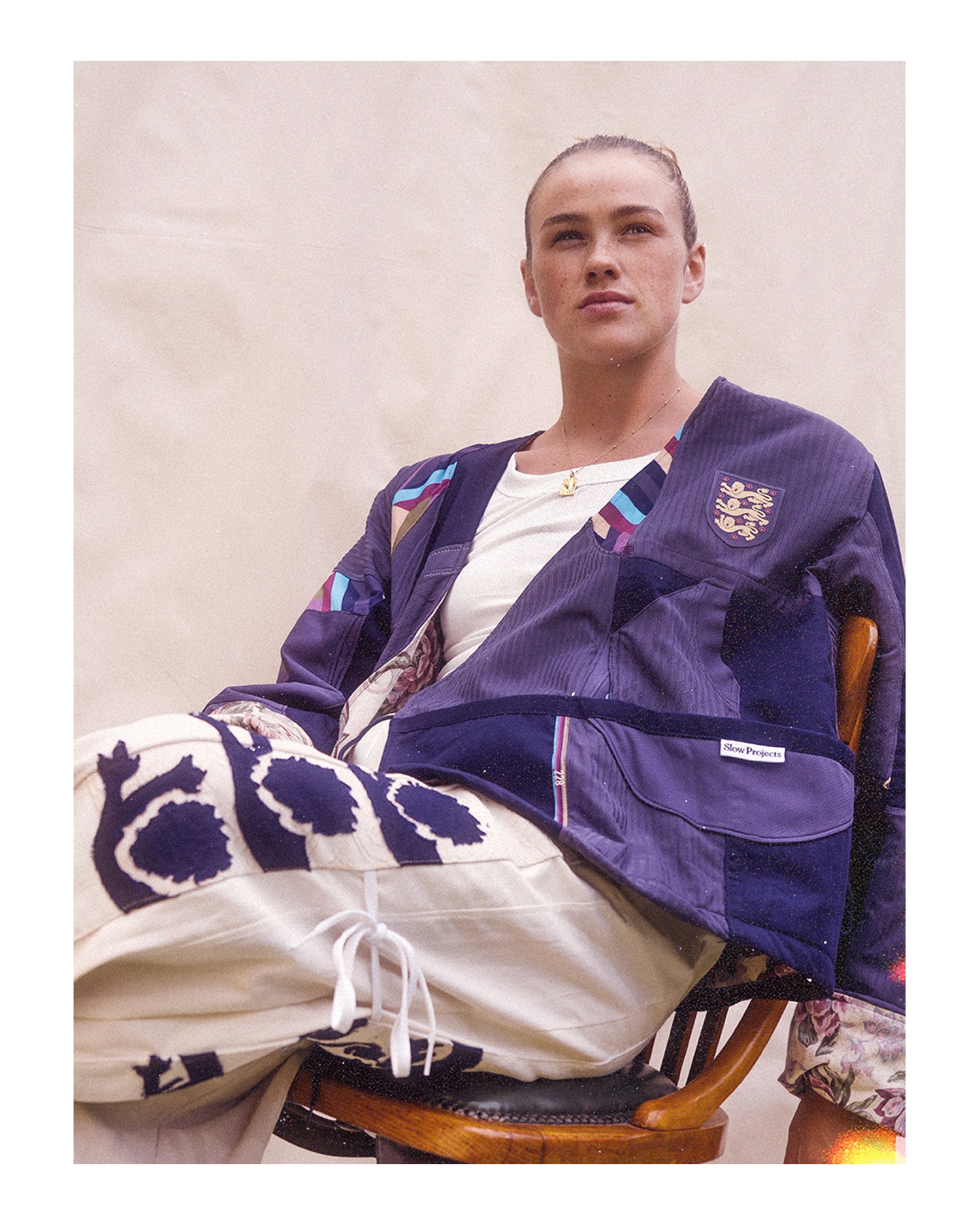 “Creating this piece with Slow Projects was a really special experience. I wanted it to reflect my creativity & flare on the pitch aligning with comfort. Wearability was a big factor for me, I feel like the piece is slightly out of my comfort zone in my day-to-day apparel but once I wore it I felt confident & at ease. Shooting with the team in my family home, specifically in the garden where my first childhood memories of kicking a ball began, so every element - from the reverse lining to the stitch detail with small frequency wave stitches that align with my spiritual beliefs - means something personal to me. Football has shaped so much of who I am, and this was a chance to show that in a different way, through fashion and creativity.”