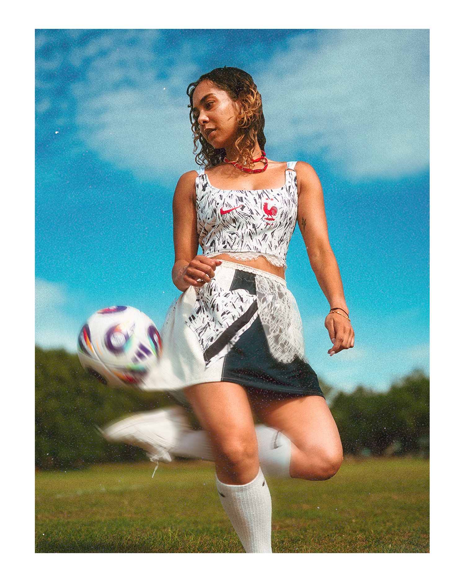 “The growth of the women’s game shows there’s space in society for more balance, care, and creativity. I can’t pretend to know what it’s like to pioneer in such a male-dominated sport, but I’ve always admired the women who do – it’s a big inspiration for how I want to challenge the fashion industry. Getting to bring women’s football and fashion together in this campaign means a lot. Having Back Market’s support really helped elevate our creative process.”