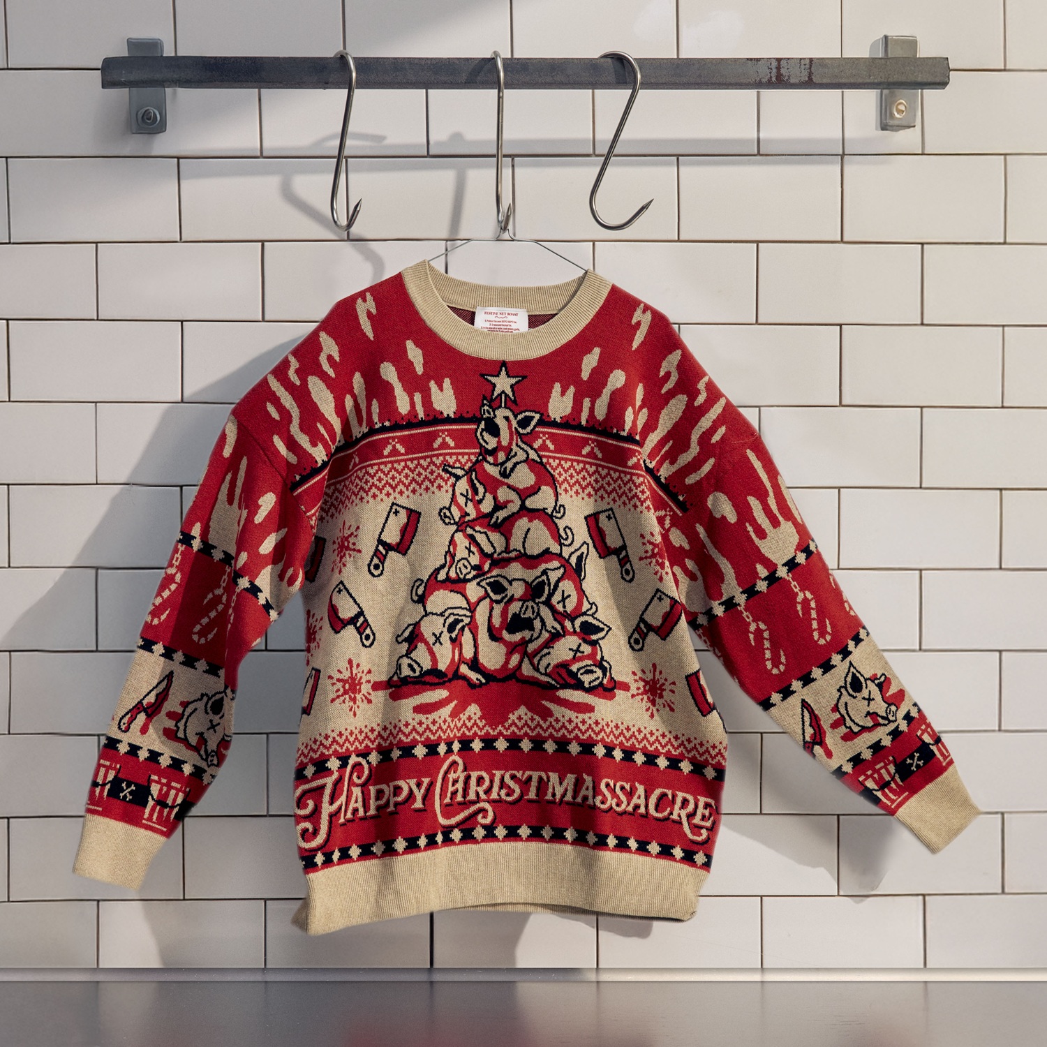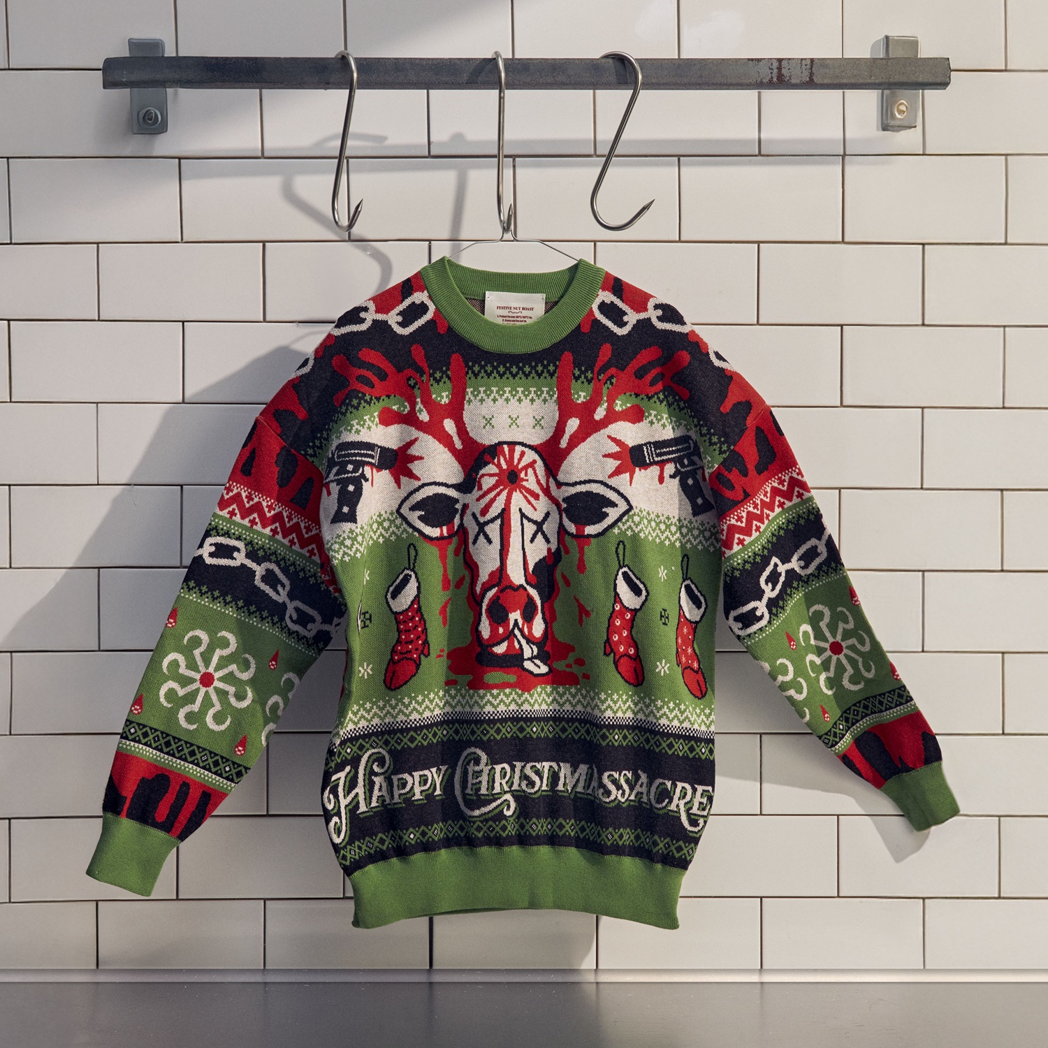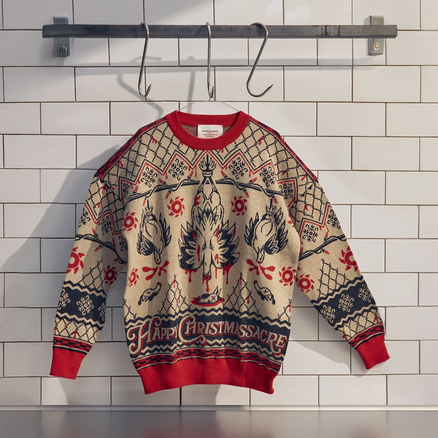 “Every year we compete to wear the ugliest Christmas jumper - but nothing is uglier than the slaughter of hundreds of thousands of animals. That’s why we’ve created the world’s ugliest Christmas jumpers to spotlight the pain and suffering behind our festive dinner plates. We tried many design routes but landed on a visual double take: from afar, a classic Christmas scene; up close, something much darker. Look closely and you’ll spot countless details, from candy-cane meat hooks to snowflake-shaped rotating saws. Huge thanks to our incredible illustration partners, Rave Growl, whose craft and care helped bring this labour of love to life.”