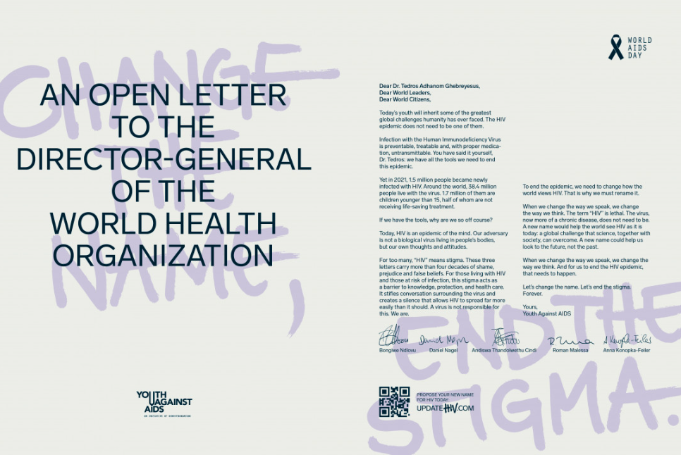 "Change the name, end the stigma" is the core message of the global campaign of the Initiative Youth Against AIDS with Serviceplan Switzerland. On the occasion of World AIDS Day today, an open letter to the Director-General of the World Health Organization, Dr. Tedros Adhanom Ghebreyesus, has been published, calling on him to officially rename HIV. The letter describes HIV as an "Epidemic of the Mind," and it caused and perpetuated primarily by non-medical factors.
