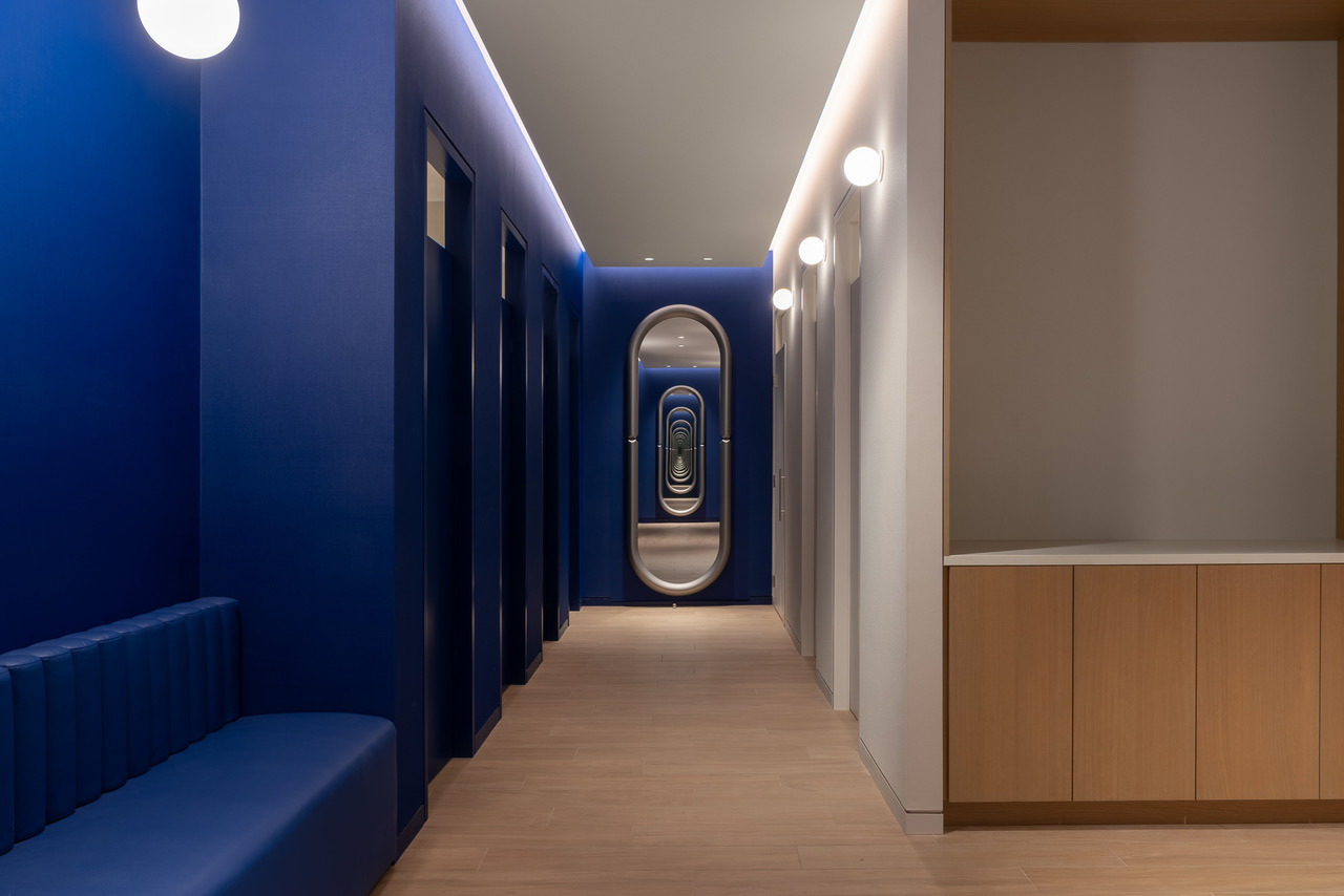 At the center of the Occasion Destination is a lounge area that serves as a dedicated waiting space for the 10 spacious fitting rooms behind. Dalziel & Pow created an ‘Instagrammable’ entrance to the fitting rooms, featuring bold mirrors that are perfect for social media moments.
