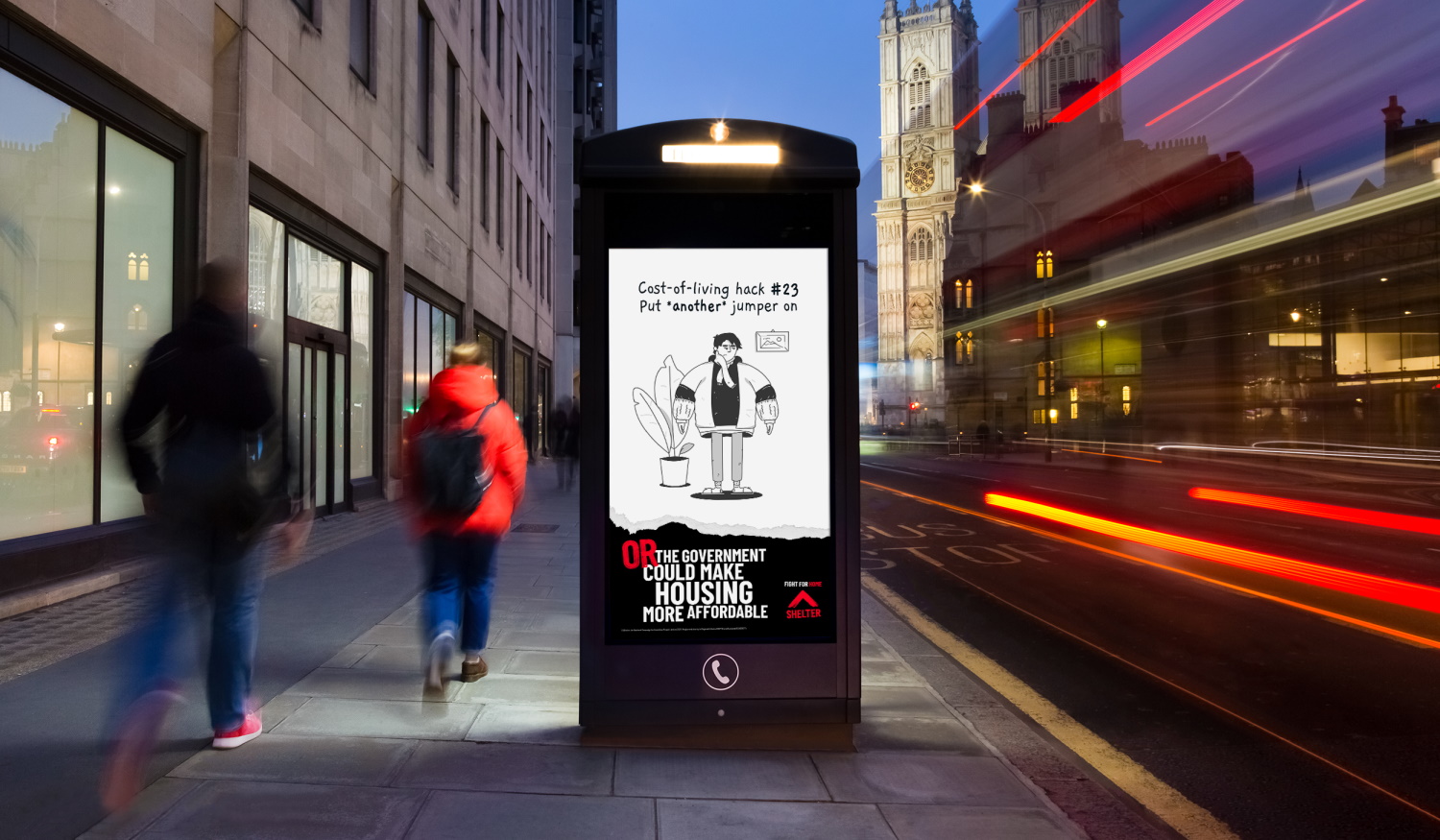 The strategy behind the national campaign was developed internally after Shelter research found that almost 1.1 million private renters in England – one in seven – had their rent increased in the last month, as well as receiving an influx of calls to its emergency helpline from people struggling to keep a roof over their heads as rents and other bills skyrocket. The creative, designed by Shelter’s in-house creative team, uses hacks illustrated by Federica Martini. These show unhelpful tips often given by the media and politicians, like; "Just work more hours!" or "Cancel your Netflix account.", which contrast with the only solution: that the government could act and make housing more affordable.