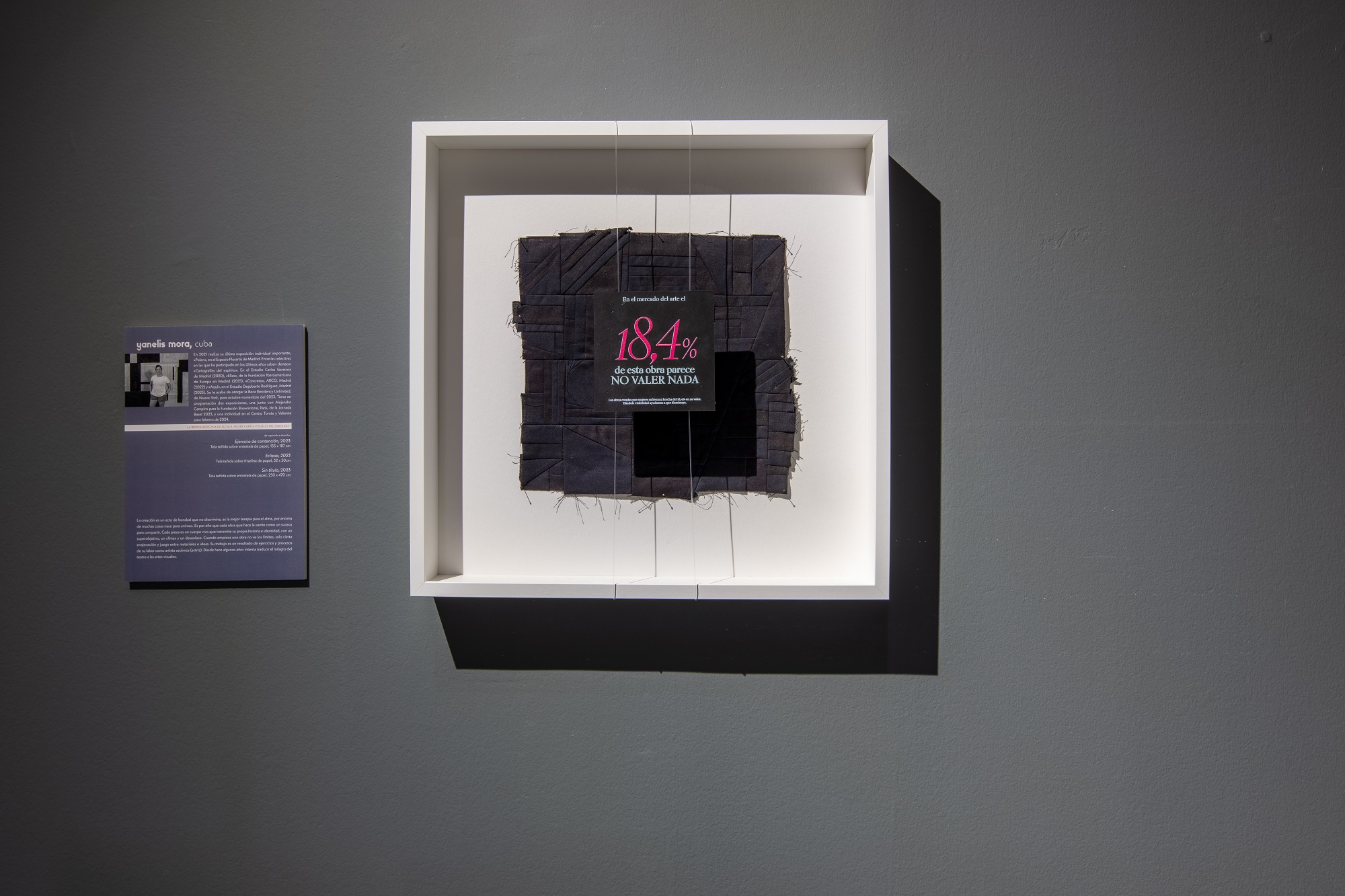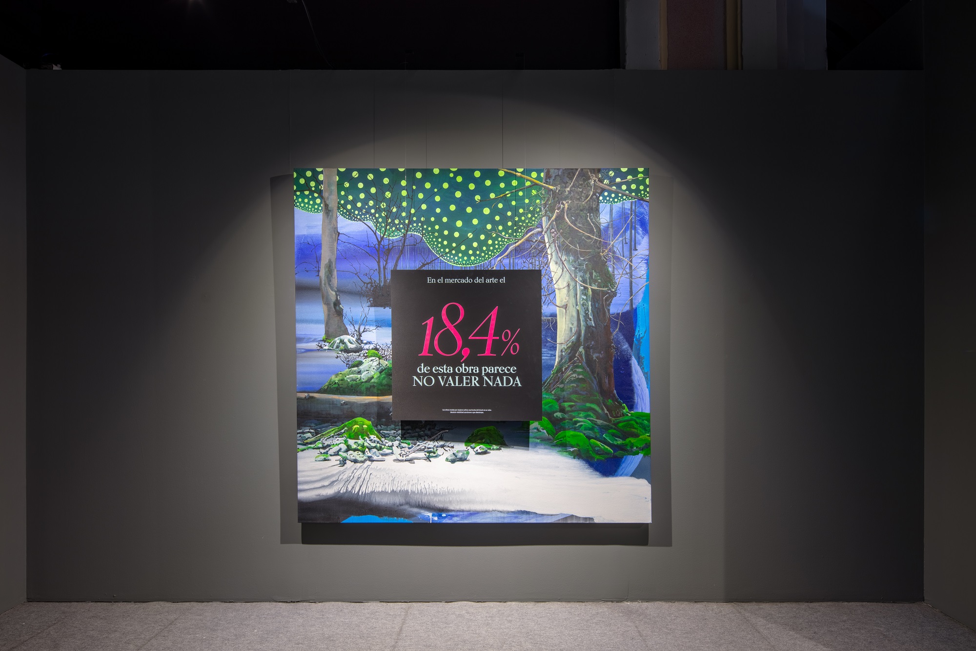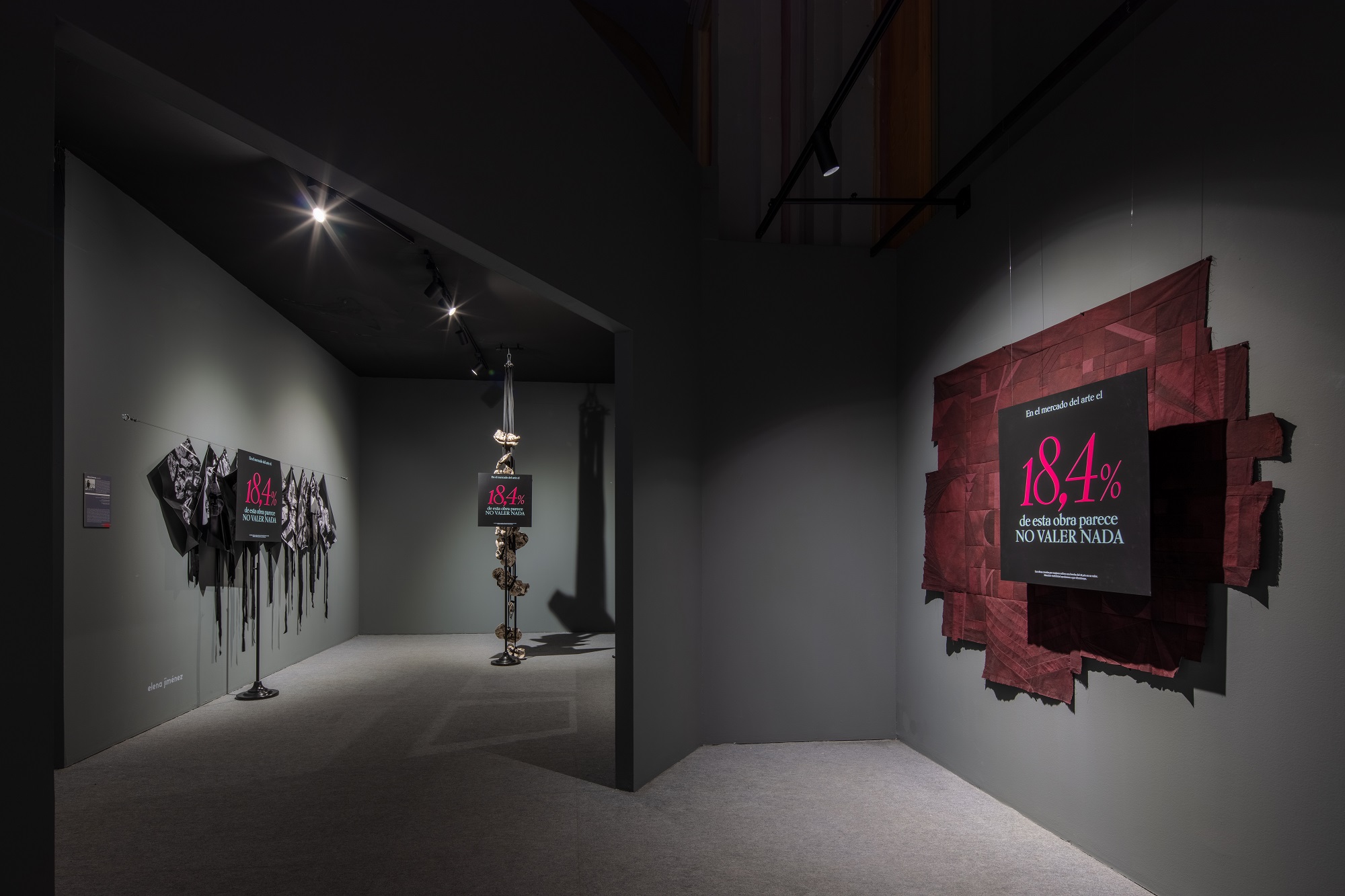 To give greater visibility to the most conclusive result of this research, selected works on show in the "La Iberoamericana de Alcalá" exhibit were displayed obscured by a placard covering 18.4% of their surface, the exact percentage of the pay gap unveiled by the research.