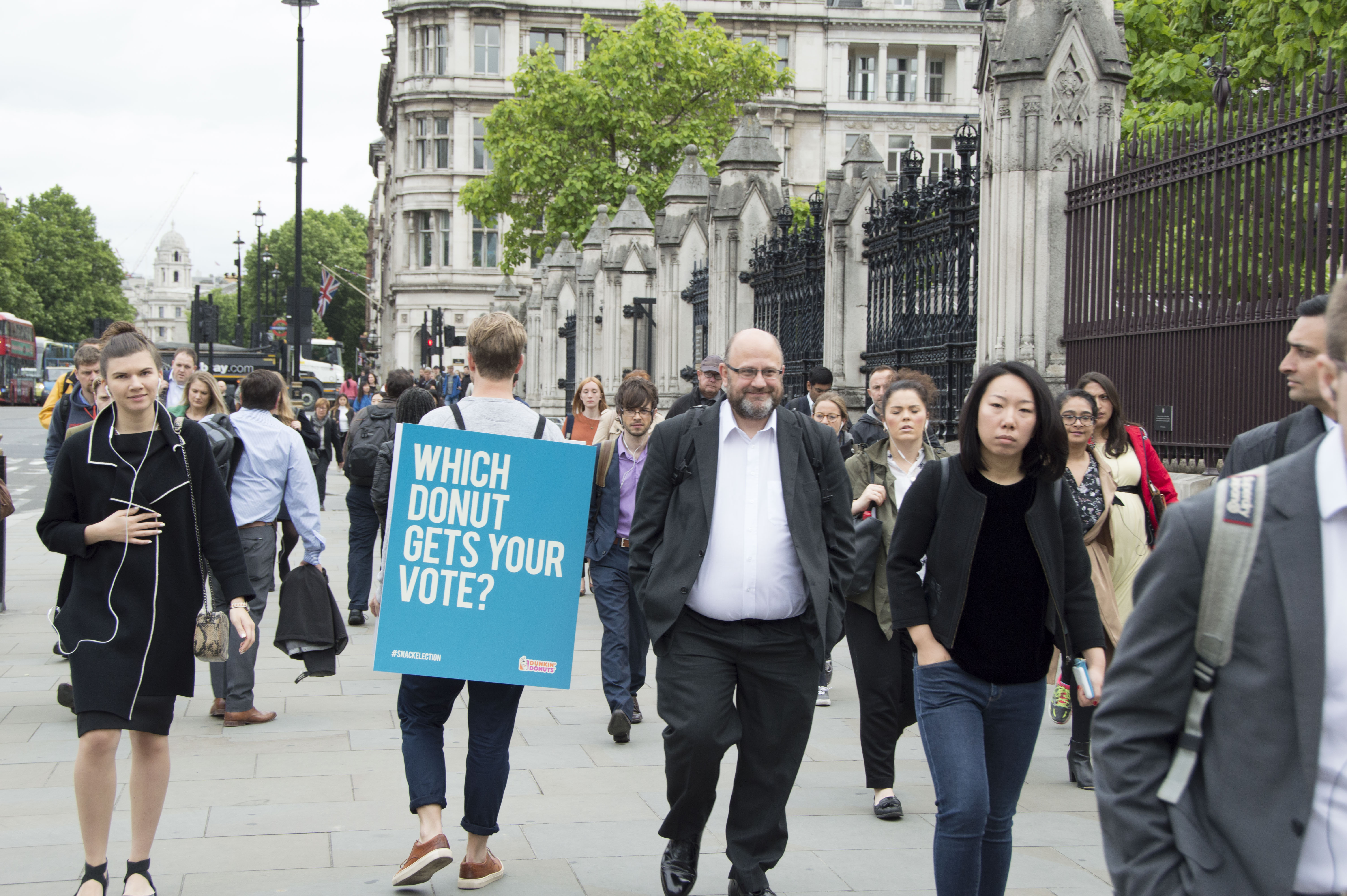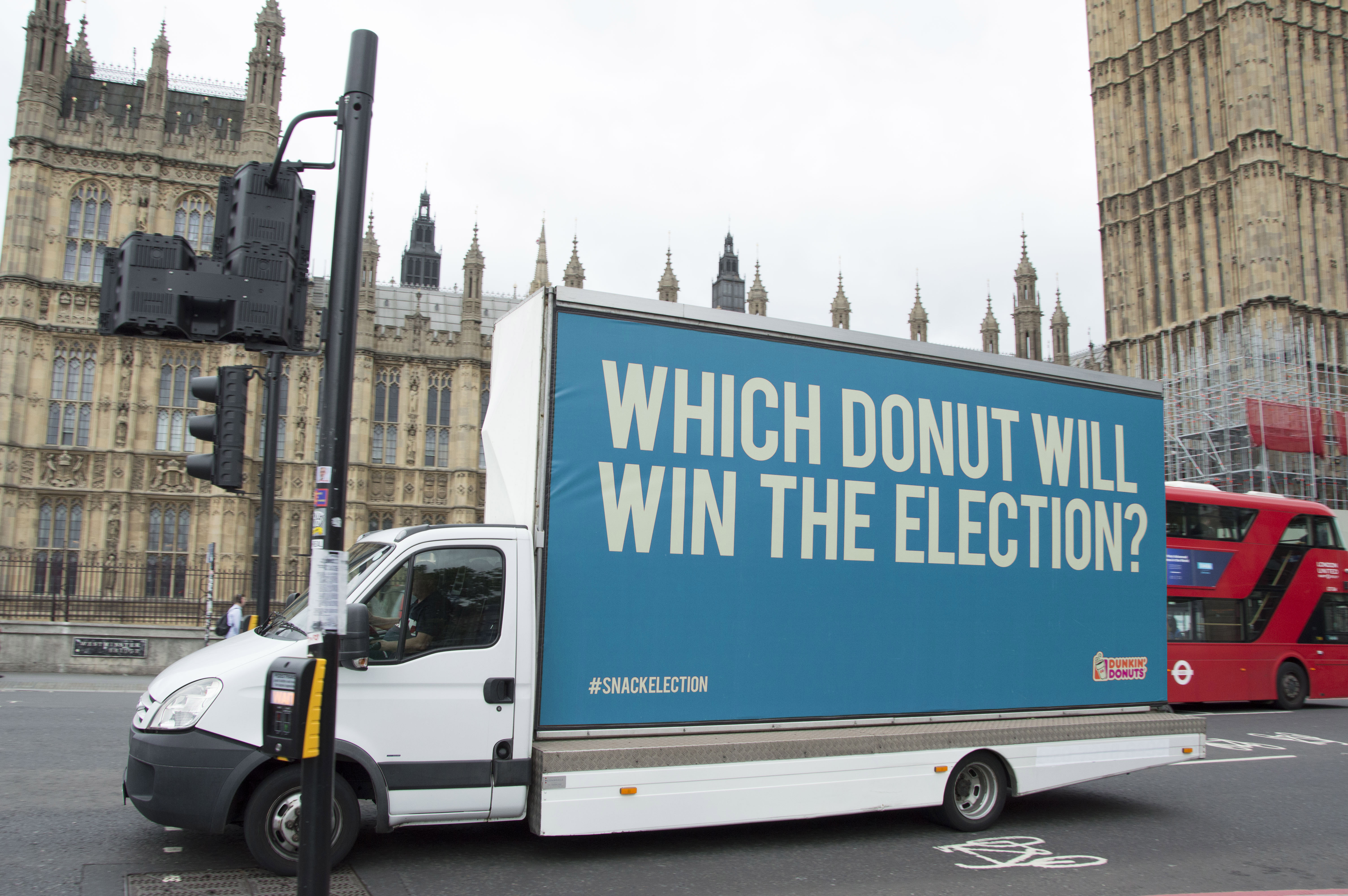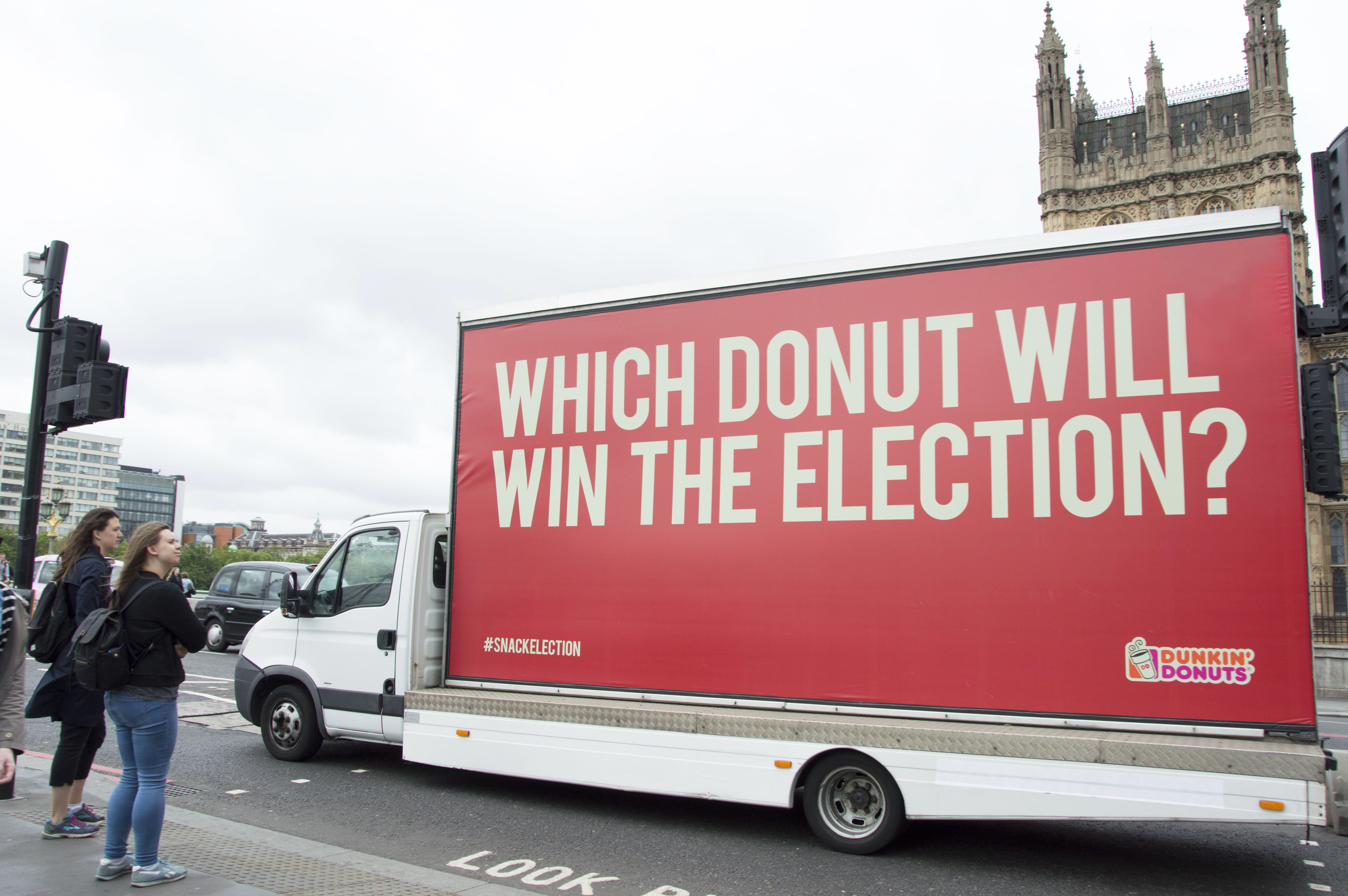 A lead poster declares: ‘June 8th. Which donut has your vote?’. This is also appearing on an AdVan touring London today on which a second poster asks: ‘Which donut will win the election?’