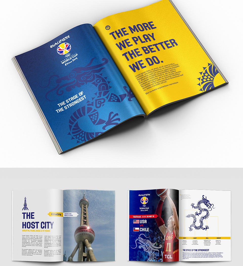 Having the logo created by a Chinese agency as a starting point, the visual ID is inspired by the story of two dragons competing for victory through the Qualifiers. The dragons evolve with each game until they reach their full-grown form in time for the first-ever 32-team World Cup in 2019. It is a flexible and modular visual identity in which the elegance and dynamism of the sport is represented by the fluid movement of the dragons.